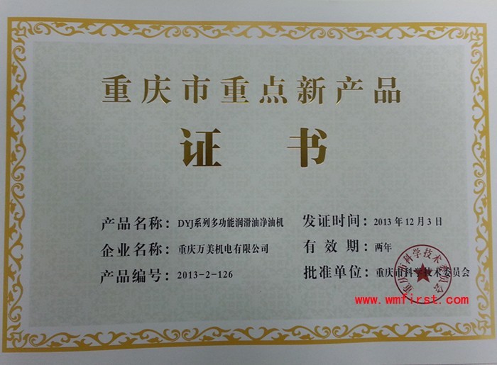 熱烈祝賀,我公司的“DYJ系列多功能潤滑油凈油機”、“ZLA系列高效雙級真空濾油機”經(jīng)重慶市科學技術(shù)委員會相關(guān)專家的鑒定,榮獲重慶市科學技術(shù)委員會頒發(fā)的重慶市重點新產(chǎn)品證書。而在此之前,我公司的這兩個系列的凈油機(濾油機)就已是專利及高新技術(shù)產(chǎn)品。此外,我公司還有多款濾油機擁有專利和高新技術(shù)產(chǎn)品稱號。