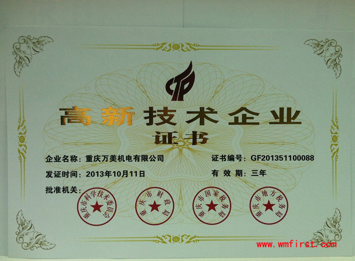 暨上次2010年再次獲得重慶市高新技術(shù)企業(yè)證書,此次復審通過,是我公司持續(xù)研發(fā)和創(chuàng)新的必然!同時這一榮譽是我公司上下全體同事齊心、努力、奮進和相關(guān)領導大力支持的結(jié)果!我們將沿著這條道路持續(xù)下去,在未來,請相信萬美,會給您帶去越來越好的產(chǎn)品!